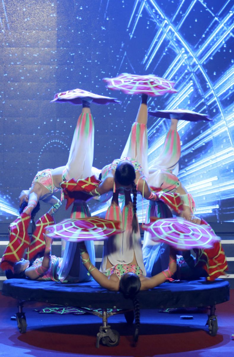 Thí sinh Bá Đức dự thi với tiết mục lăn vòng nghệ thuật tập thể với sự hỗ trợ của các nam nghệ sĩ đến từ Đoàn Xiếc TP.HCM.