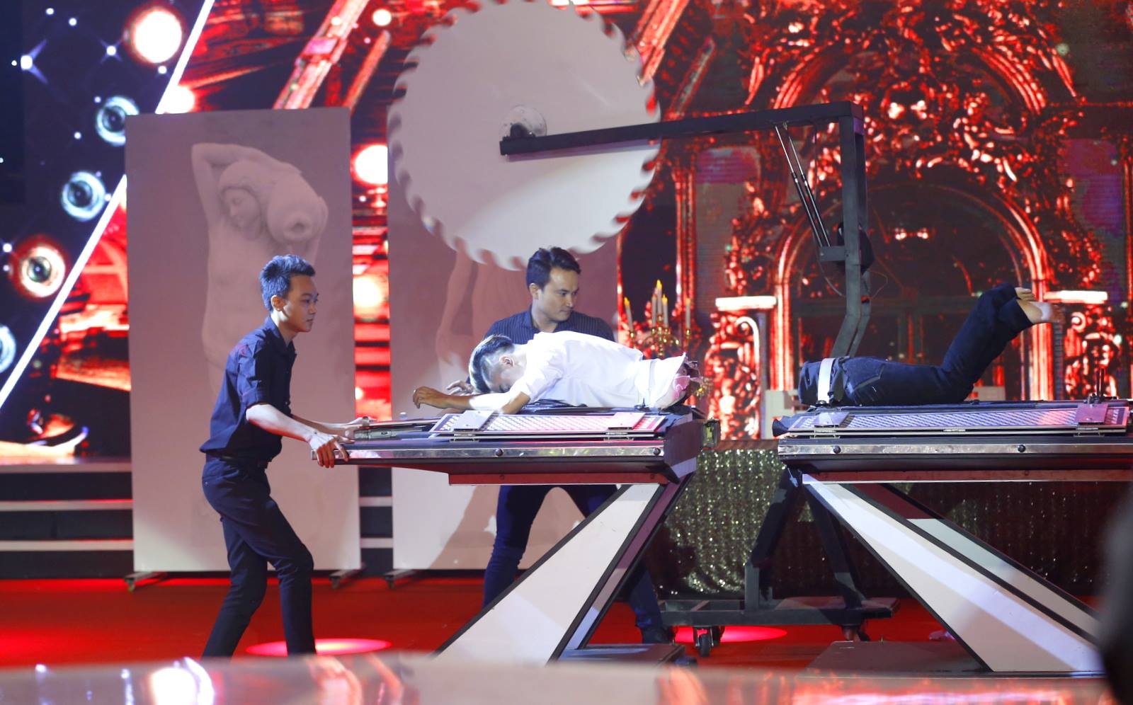 (ĐSVH) Trong đêm đầu tiên tái ngộ với khán giả của Kỳ Tài Lộ Diện, ảo thuật gia 18 tuổi đã tái hiện tiết mục ấn tượng nhất của mình ở mùa 1 đó là cưa đôi người làm 2, tách rời phần thân trên và phần thân dưới.