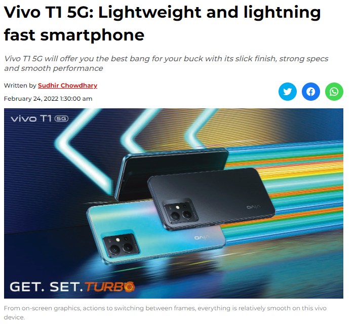 Cụ thể, tờ Financial Express giật tít: “vivo T1 5G, chiếc điện thoại nhẹ và nhanh như chớp"
