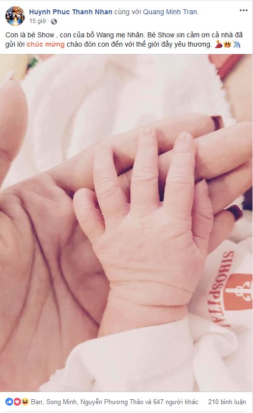Chiều 5/1, Thanh Nhân hạ sinh tiểu công chúa nặng 3,3kg. Càng đặc biệt hơn nữa khi ngày sinh của bé cũng chính là sinh nhật của DJ Wang Trần, và con gái chính là món quà vô giá mà nữ đạo diễn dành tặng ông xã, giúp cả nhà chào đón niềm hạnh phúc nhân đôi. Tên gọi thân mật của cô công chúa nhỏ là bé Show.