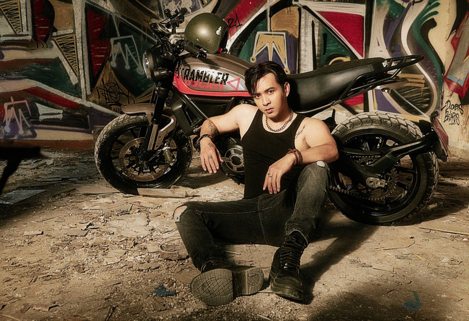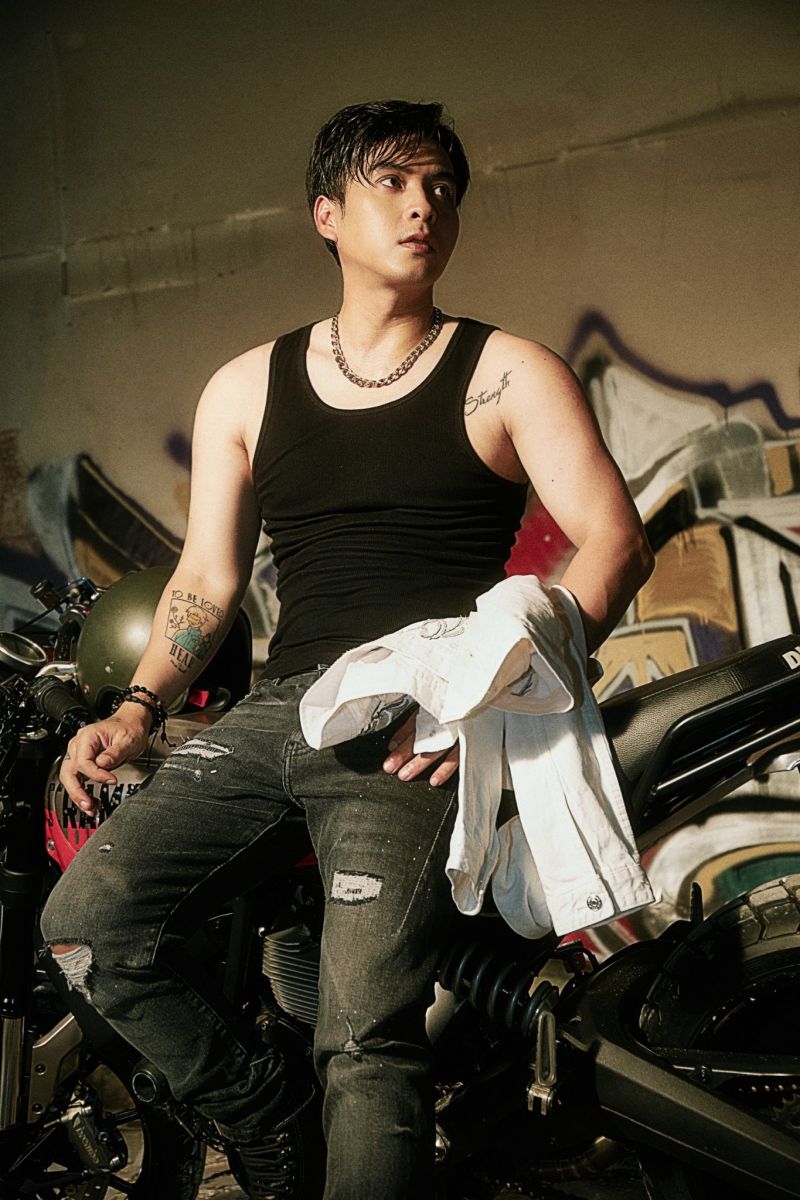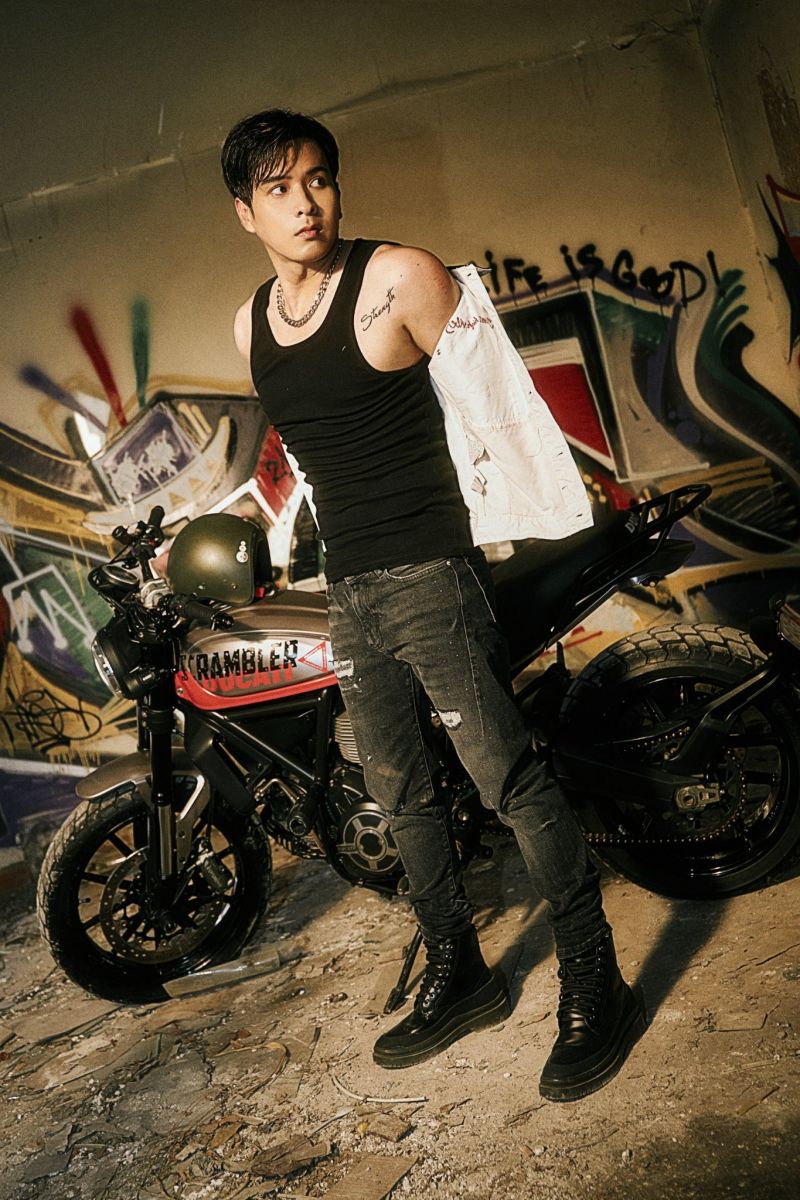 Giọng ca “Con bướm xuân” khoe vẻ nam tính với áo thun tối giản, kết hợp cùng quần jean, áo khoác da. Chọn bối cảnh khu nhà hoang, lái xe mô tô phân khối lớn, Hồ Quang Hiếu thể hiện thần thái cực ngầu trước ống kính.