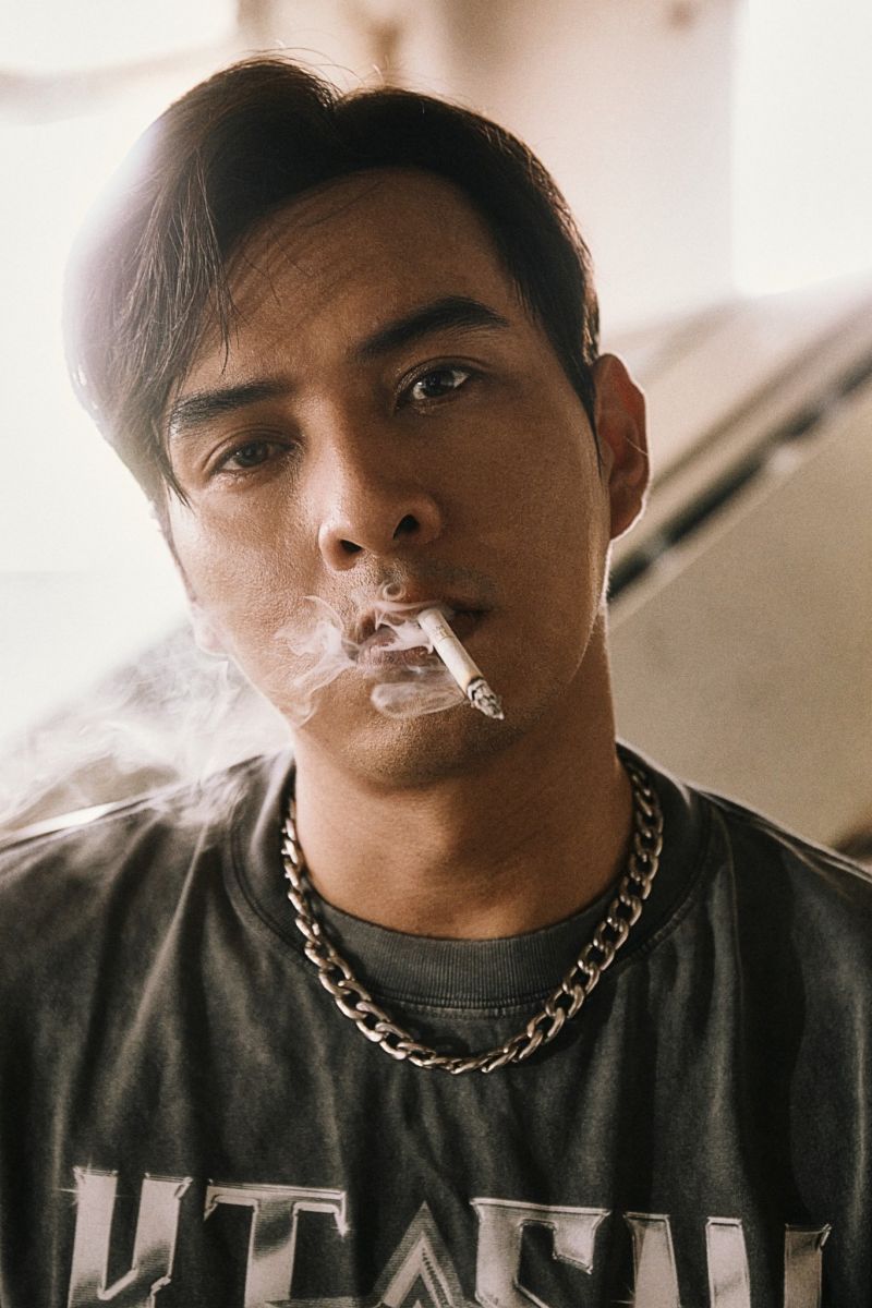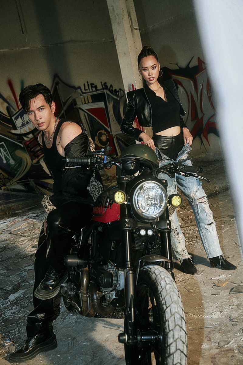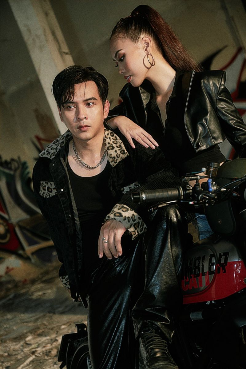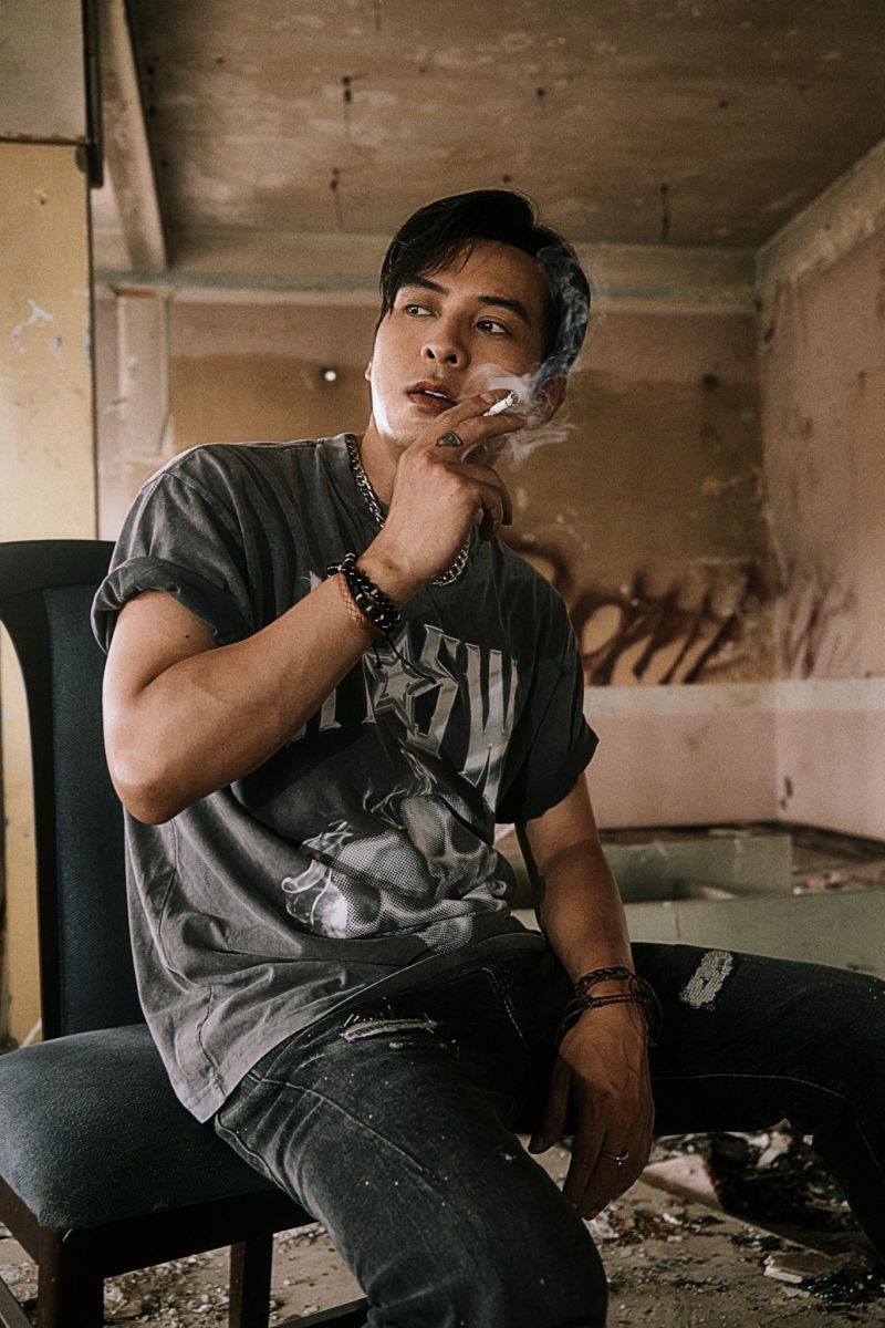 Giọng ca “Con bướm xuân” khoe vẻ nam tính với áo thun tối giản, kết hợp cùng quần jean, áo khoác da. Chọn bối cảnh khu nhà hoang, lái xe mô tô phân khối lớn, Hồ Quang Hiếu thể hiện thần thái cực ngầu trước ống kính.