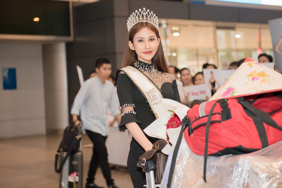 Diện chiếc váy đen năng động và nữ tính, Chi Nguyễn bước ra khỏi sảnh chờ với nụ cười rạng rỡ và sự tự tin. Với chiếc vương miện danh giá đội trên đầu, Chi Nguyễn nhanh chóng khuấy động khu vực sân bay, nhiều hành khách lập tức chú ý và xin lại chụp ảnh.