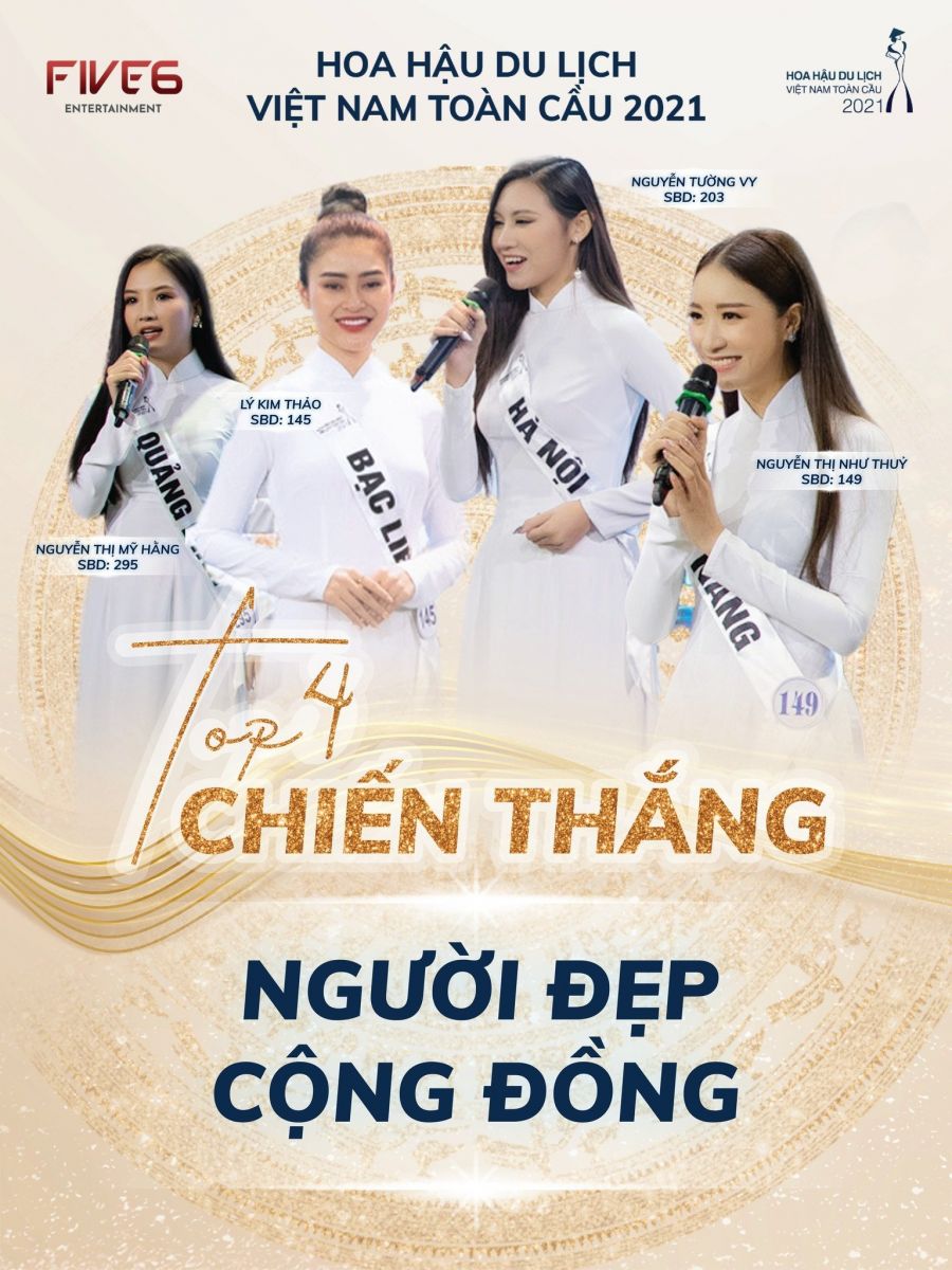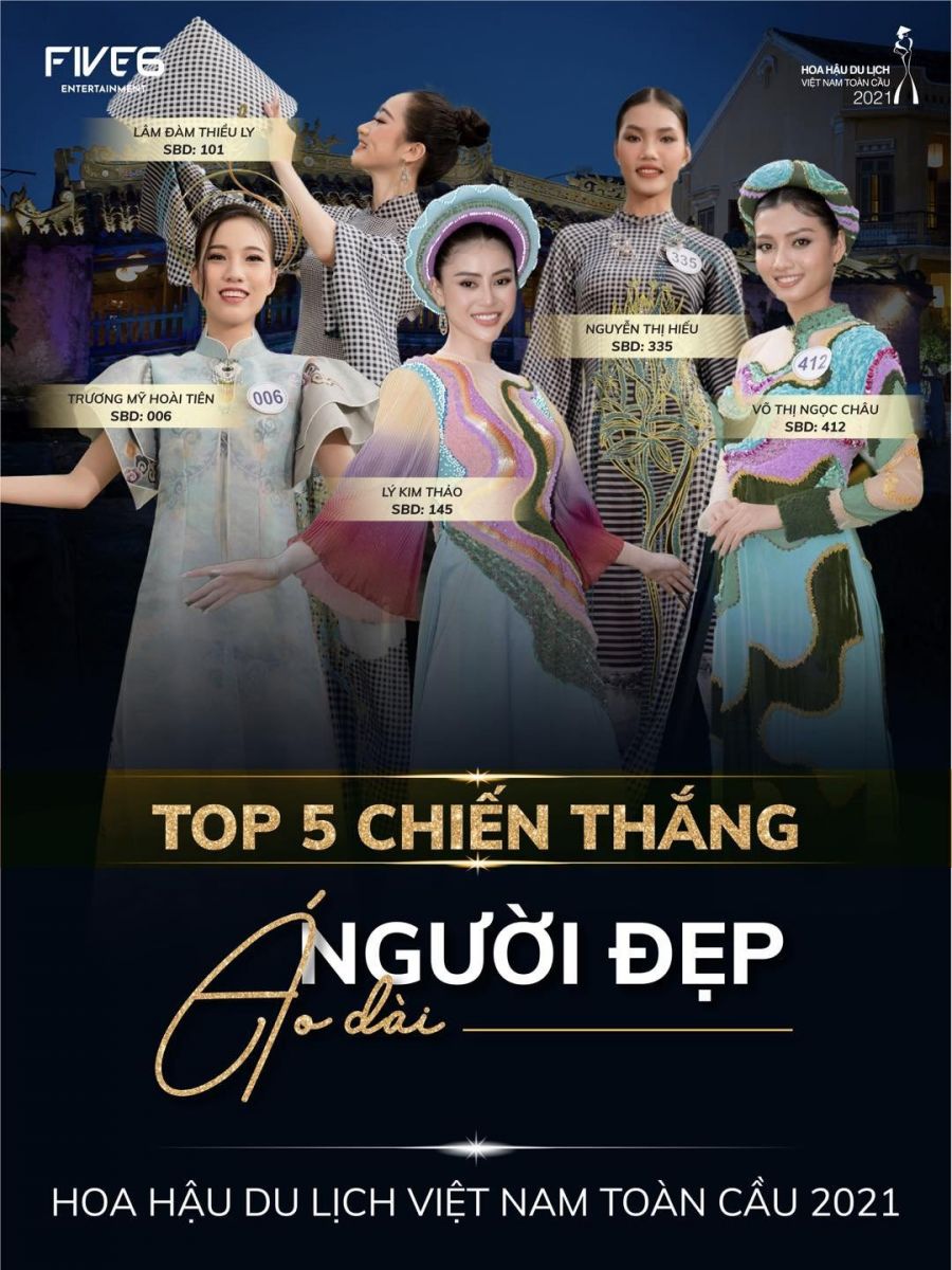 Bên cạnh đó, Top 5 Người đẹp áo dài cũng chính thức lộ diện gồm Lý Kim Thảo (SBD 145 - Bạc Liêu), Võ Thị Ngọc Châu (SBD 412 - Long An), Trương Mỹ Hoài Tiên (SBD 06 - Thừa Thiên Huế), Lâm Đàm Thiều Ly (SBD 101 - Lạng Sơn), Nguyễn Thị Hiếu (SBD 335 - Bình Phước).