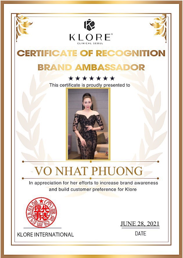 Mới đây, người đẹp được hàng mỹ phẩm danh tiếng Hàn Quốc Krole chọn làm đại sứ thương hiệu tại Việt Nam. Dòng sản phẩm chăm sóc da Klore đã được Nhật Phượng sử dụng hơn năm qua và thấy rất hiệu quả, bây giờ đi đâu cô cũng mang theo. Người đẹp chia sẻ bí quyết làm đẹp của mình là luôn chăm chỉ tập yoga, dinh dưỡng hợp lý, nhất là không được bỏ qua các bước làm đẹp cũng như dùng sản phẩm chăm sóc da chất lượng.