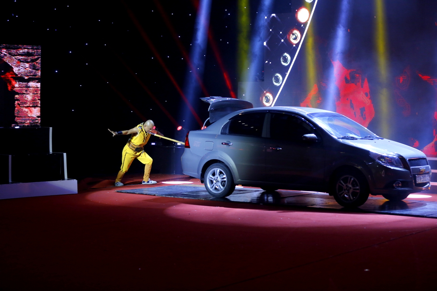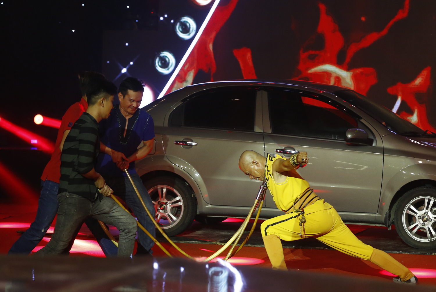 Đầu tiên, anh và các nghệ sĩ hỗ trợ biểu diễn một cảnh hành động, trong đó 3 nghệ sĩ dùng các mũi giáo đâm vào yết hầu của anh nhưng không làm anh bị thương mà các ngọn giáo còn bị Minh Nhật dùng yết hầu bẻ gãy. Kế đến, Minh Nhật dùng một ngọn giáo cắm phần đế vào chiếc ô tô 4 chỗ và phần lưỡi giáo cắm vào cổ của mình để đẩy chiếc ô tô đi 1 đoạn trên sân khấu.