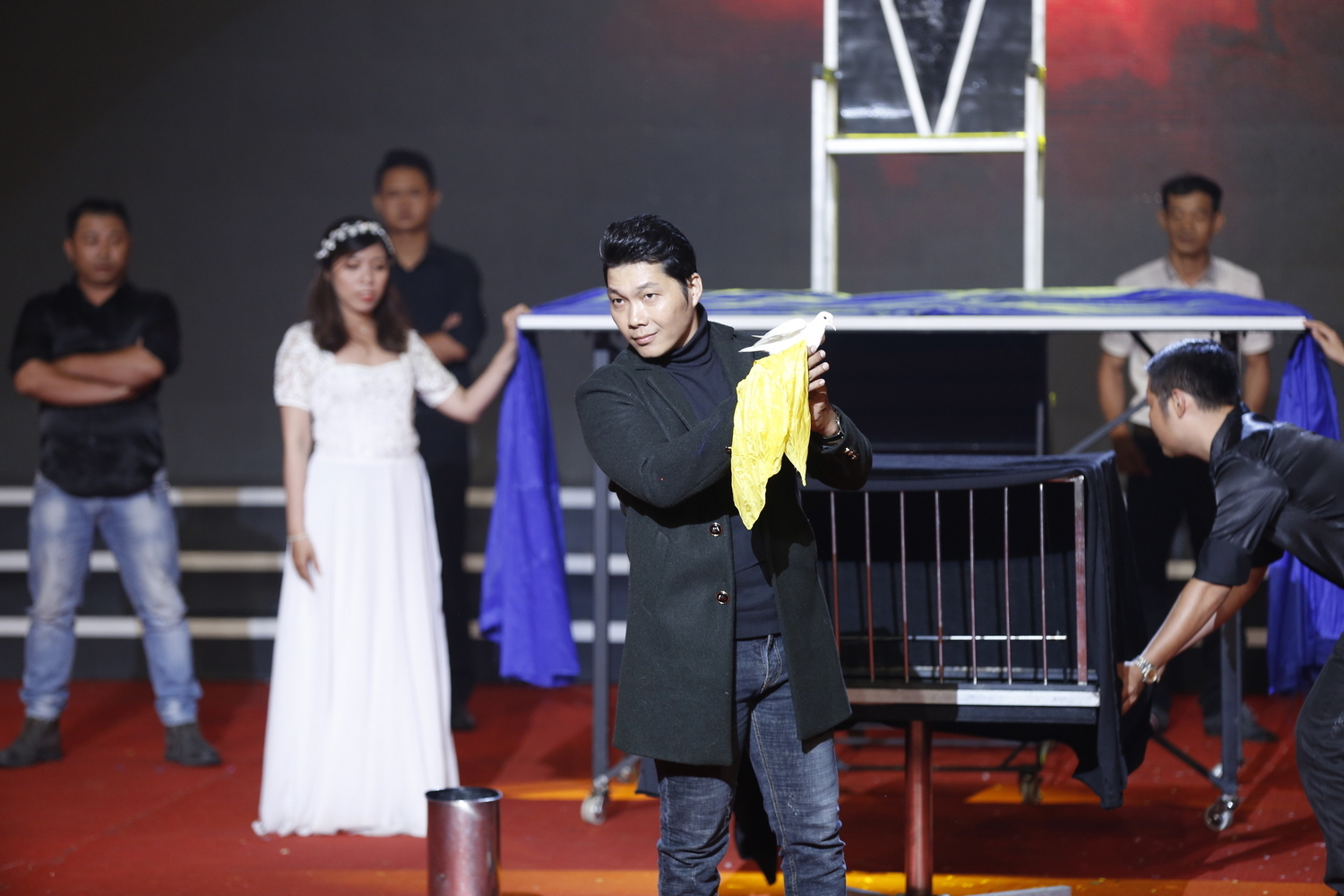 Ảo thuật gia Nguyễn Sen mang đến sân khấu những tiết mục mang màu sắc cổ điển, hài hước nhẹ nhàng như ảo thuật bài, biến ra chim bồ câu từ trong nón, khăn lụa…