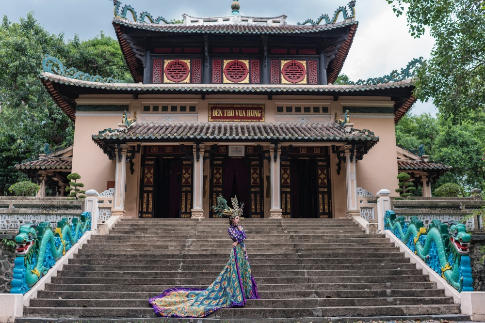 Được biết, tổng khối lượng bộ trang phục nặng xấp xỉ 20 kg, trong đó phần tà áo được may bằng vải lụa mượt mà màu xanh biển pha lẫn sắc tím hoàng tộc. Hình ảnh chim khổng tước biểu tượng của cuộc sống gia đình trọn vẹn, hôn nhân hạnh phúc, công danh giàu có, sung túc được thêu tỉ mẩn, kết cườm chạy dọc từ thân áo xuống đuôi tà áo và được vẽ phác họa bởi 99 lông công mềm mại, uyển chuyển.Điểm nhấn của bộ trang phục chính là chiếc mấn tinh xảo có sự hỗ trợ từ nhà thiết kế Thuý Loan. Chị đã sáng tạo, cách điệu hình ảnh con khổng tước ánh vàng lấp lánh và sử dụng 99 lông công thật được đính tỉ mẩn. Con số 99 cũng hàm ý nhiều thông: Số 9 là số tượng trưng cho quyền lực, vĩnh cửu và cũng là sự tinh hoa của trời đất. Số 99 gồm hai số 9 đi với nhau cũng có thể được hiểu là: Thông qua sự cân bằng chẵn lẻ – âm dương, con số biểu thị cho sự cân bằng hòa hợp trong cuộc sống.