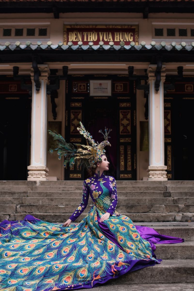 Sử dụng hình ảnh chim khổng tước được thực hiện khéo léo trên nền tà áo dài truyền thống Việt Nam, NTK Tuấn Hải đã thổi làn gió mới vào bộ trang phục, giúp áo dài Việt thêm phần uyển chuyển và lại có thêm sự uy nghi quyền lực.