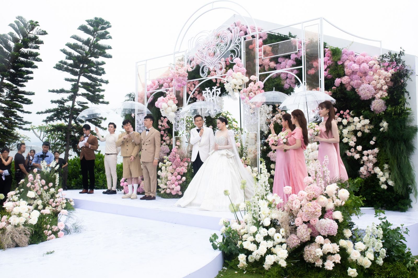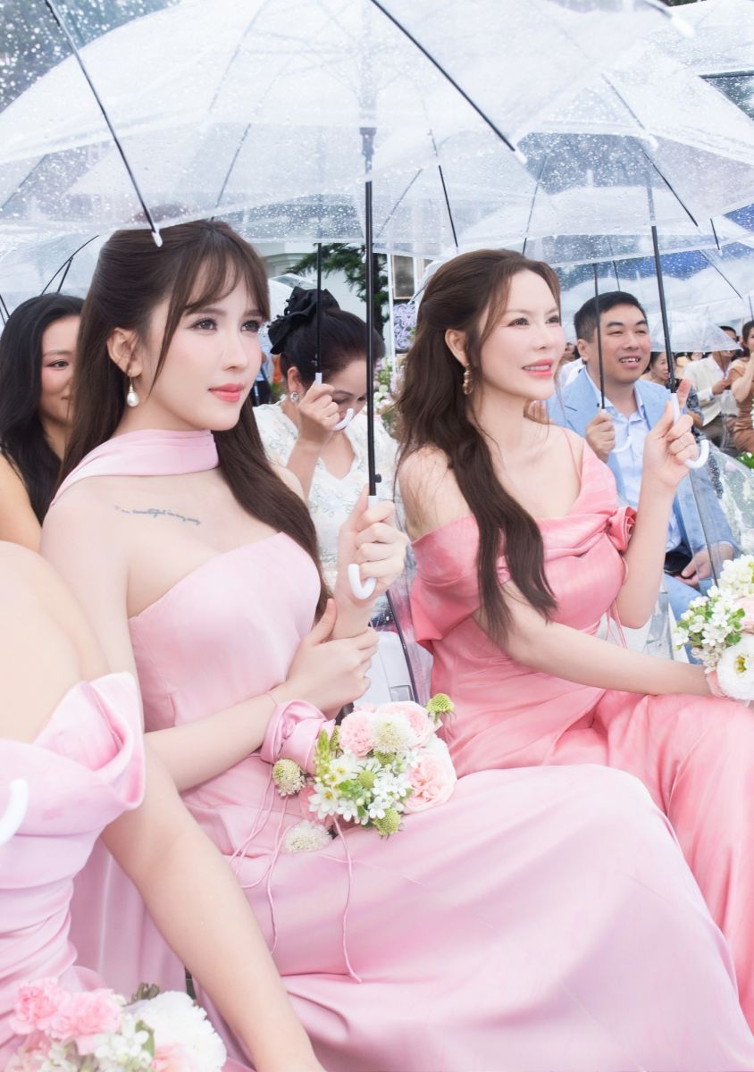 Lý Nhã Kỳ, cùng với Thiều Bảo Trâm và Myra Trần, là ba phù dâu diện váy hồng pastel đồng điệu. Nhưng giữa ba người, tình bạn giữa Lý Nhã Kỳ và Hồ Quỳnh Hương mang một chiều sâu riêng. Từ ánh mắt, cử chỉ chăm sóc, những lời thì thầm động viên, đến khoảnh khắc nắm tay nhau thật chặt – tất cả đều toát lên sự gắn bó hiếm có giữa hai tâm hồn đồng điệu.