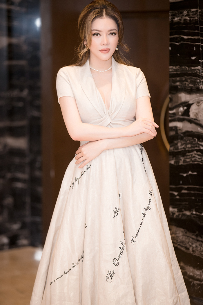Song song với phong cách quyền lực sang trọng là vẻ dịu dàng, thanh lịch. Lãnh sự Danh dự Rumani lựa chọn chiếc váy xòe trắng với họa tiết chữ được in 3D tinh tế tôn lên làn da trắng không tì vết của cựu Đại sứ du lịch. Phần cổ áo được khoét sâu khoe vẻ đẹp quyến rũ nhưng không hề gây phản cảm, phù hợp với tính chất công việc mà cô đang đảm nhiệm. Lý Nhã Kỳ tiết chế các trang sức và chỉ sử dụng hoa tai, vòng ngọc trai nhưng cũng đủ tạo điểm nhấn cho set đồ này. Không thể phủ nhận rằng chính kiểu tóc buộc thấp với phần mái được uốn nhẹ kết hợp với lối trang điểm đơn giản với điểm nhấn ở mắt đã góp phần tạo nên một tổng thể hài hòa cho người đẹp gốc Vũng Tàu.
