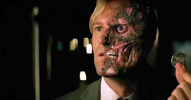 Tuy nhiên, sau một vụ nổ nghiêm trọng do Joker gây ra, nửa mặt của Harvey Dent bị biến dạng đáng sợ. Sự biến đổi này không chỉ tạo nên ngoại hình đáng sợ mà còn ảnh hưởng đến tâm trí của Harvey. Two-Face trở thành một tên tội phạm máu lạnh và bất lương, quyết định số phận của người khác bằng cách tung đồng xu. Một mặt của đồng xu là sống, mặt còn lại là cái chết. Anh ta quyết định tất cả theo cách này, tạo ra một tên tội phạm khủng khiếp trong thế giới ngầm của thành phố Gotham. Two-Face là một trong những đối thủ khó nhằn nhất mà Batman đã từng đối mặt trong bộ ba phim này và đã thể hiện một cách xuất sắc sự trỗi dậy của phe ác.