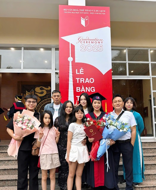 Ngày tốt nghiệp cũng là dịp đặc biệt với gia đình nữ nghệ sĩ. Doanh nhân Võ Trấn Phương – ông xã của chị – cùng hai con đã bay ra Hà Nội để chia vui. Đông đảo người thân từ TP.HCM cũng có mặt, tạo nên một buổi lễ ấm cúng, ngập tràn cảm xúc.
